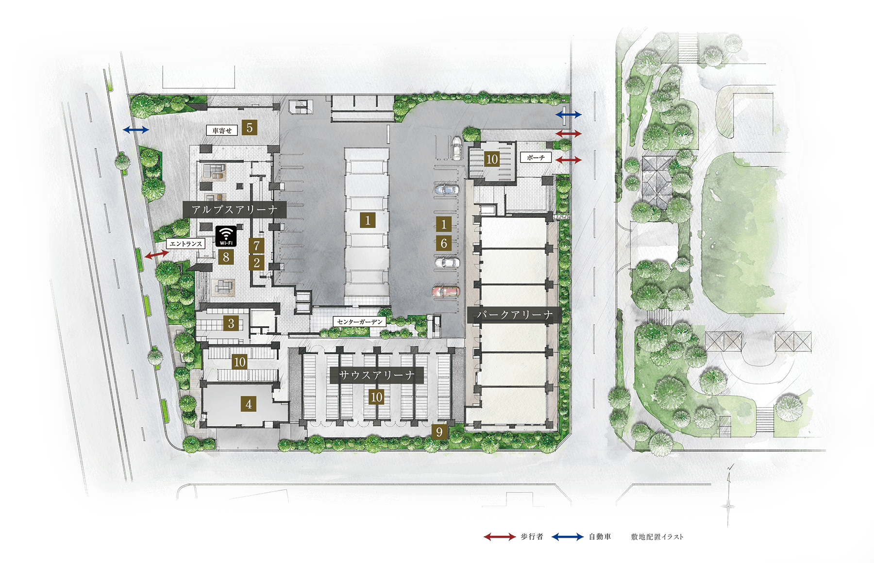 ●掲載の敷地配置イラストは、計画段階の図面を基に描き起こした敷地配置図と周辺環境を描いたもので実際とは異なります。