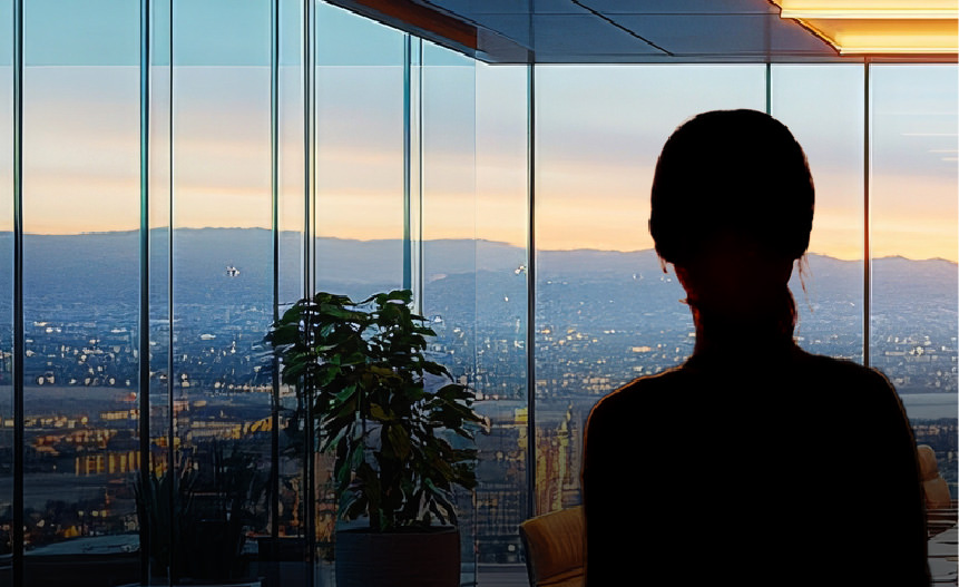 窓辺に壮大な山並みと街並みを見晴らすパノラマビューが