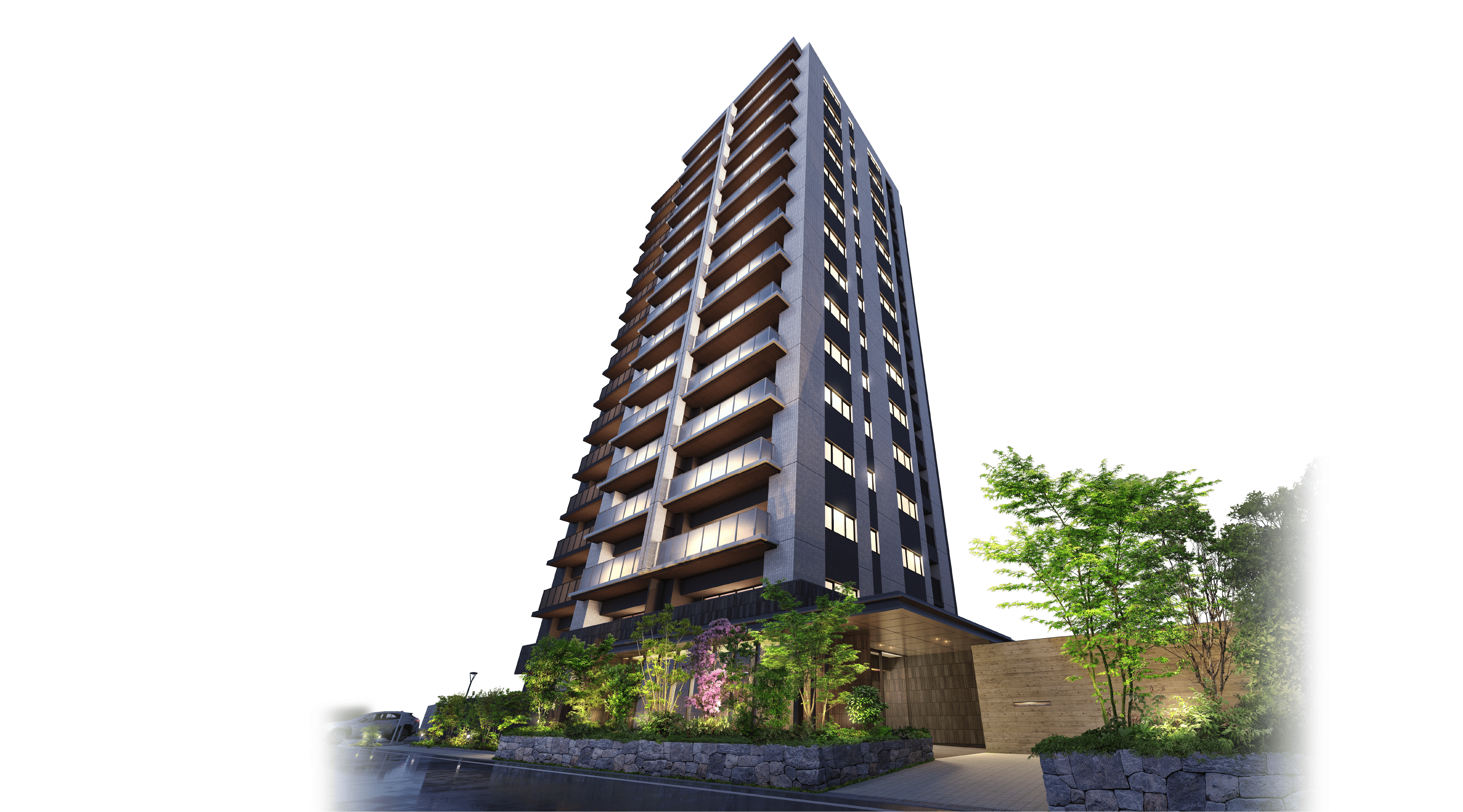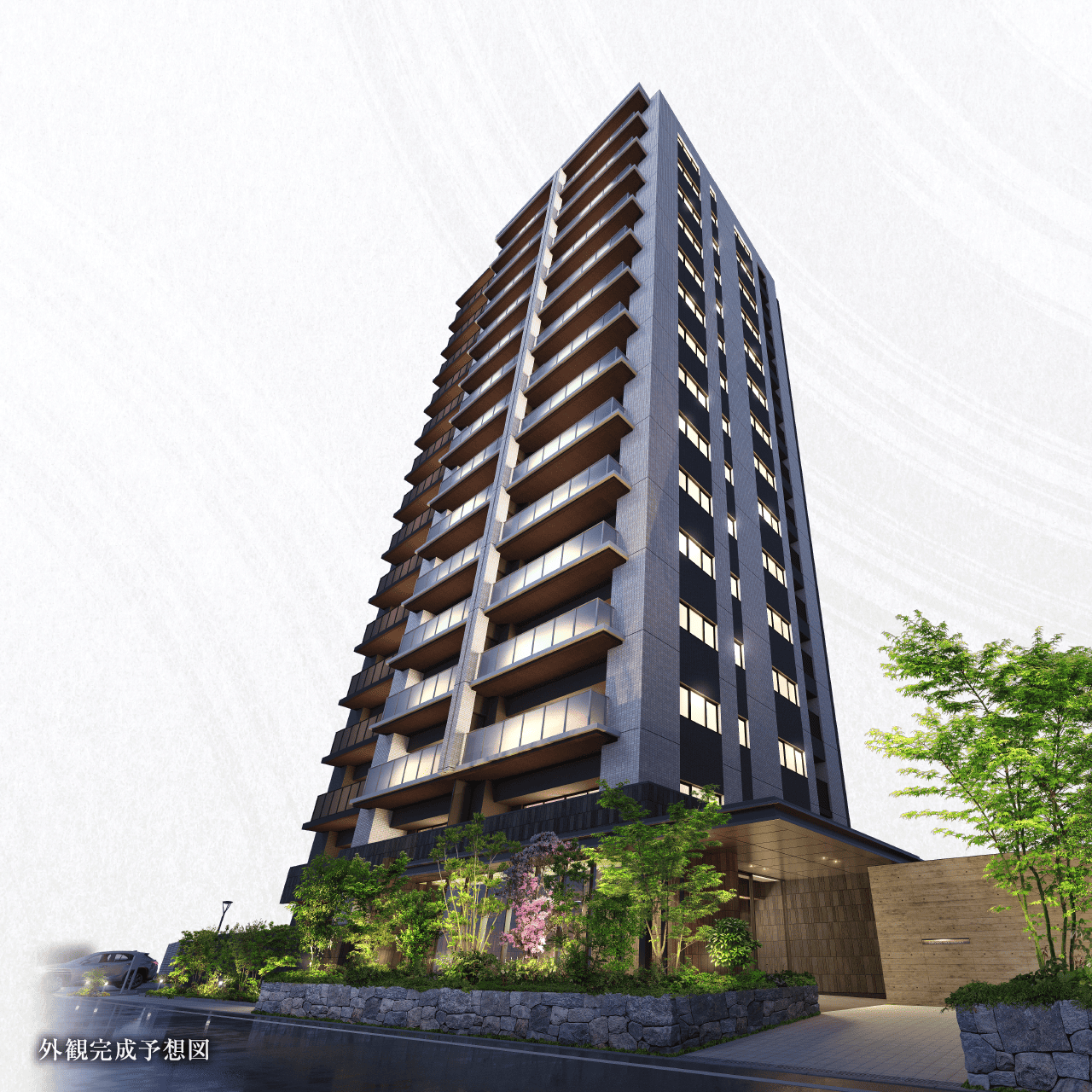 ●掲載の外観完成予想図は、設計図面を基に描き起こしたもので実際とは異なり、設計・施工上の都合により変更する場合があります。植栽は竣工時ではなく生育後を想定して描いております。