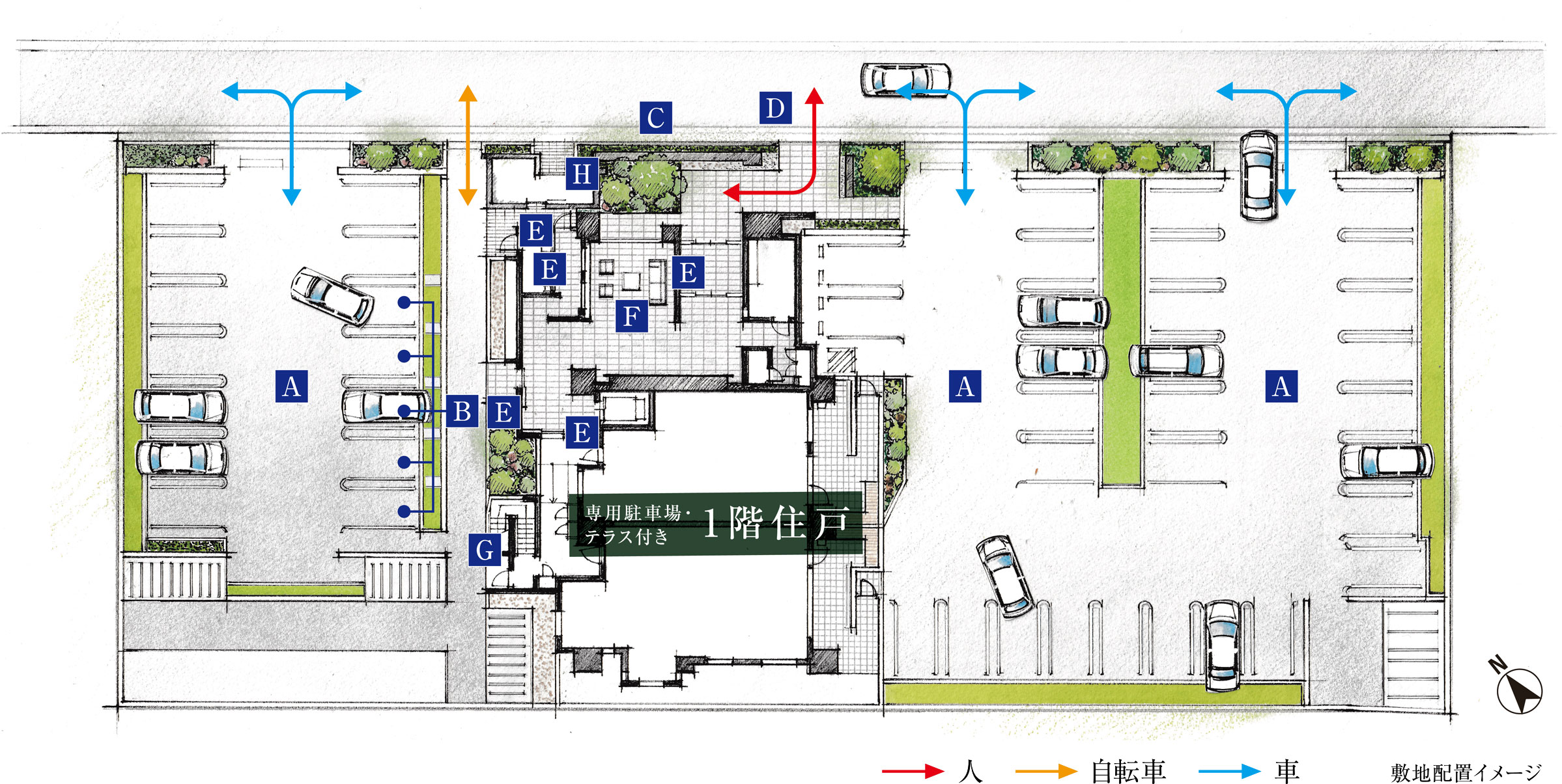 ●掲載のエントランスアプローチ完成予想図は設計図面を基に描き起こしたもので実際とは異なり、設計・施工上の都合により変更する場合があります。植栽は竣工時ではなく生育後を想定して描いております。また、本物件の外観が分かりやすいように一部周辺建物等を透視、白線化して描いています。