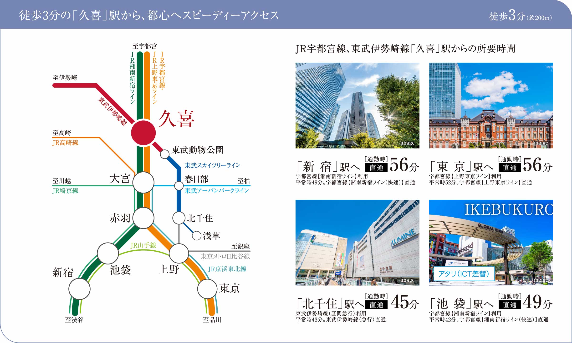 用途に応じて2つの鉄道を利用できる「久喜」駅は、快速電車が停車するため、毎日の通勤が快適です。