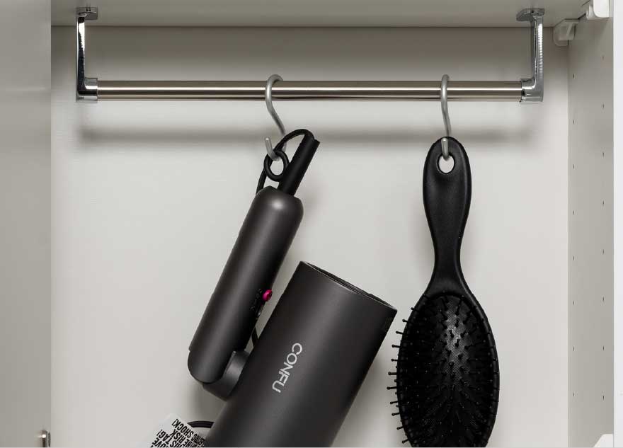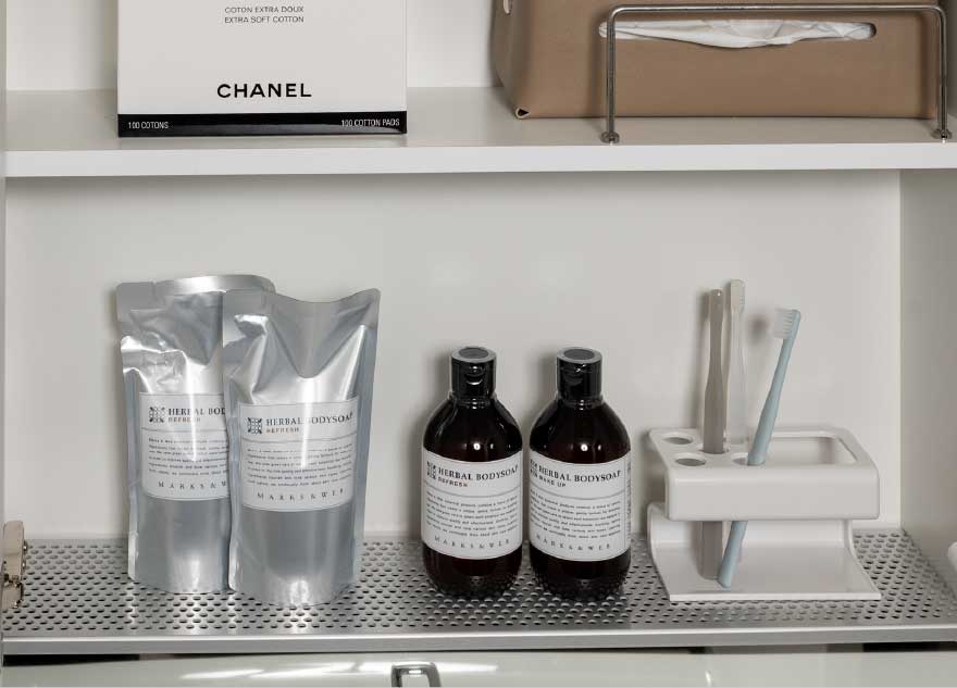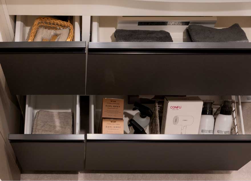 収納物の確認がしやすく、整理しやすいスライド式収納を採用。洗面台まわりがスッキリと片付きます。