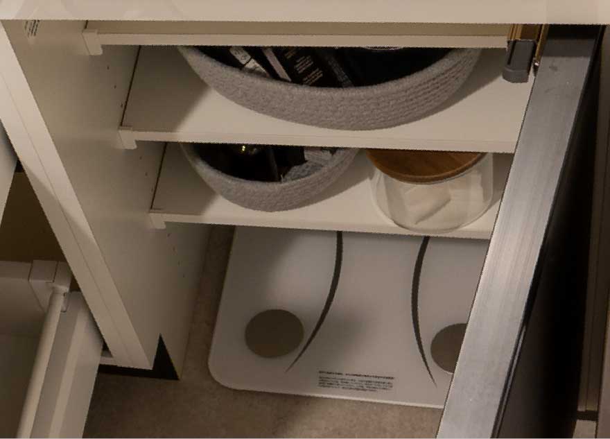 キャビネットの巾木部分に空間を設け、置場に困るヘルスメーターを収納するスペースをつくりました。