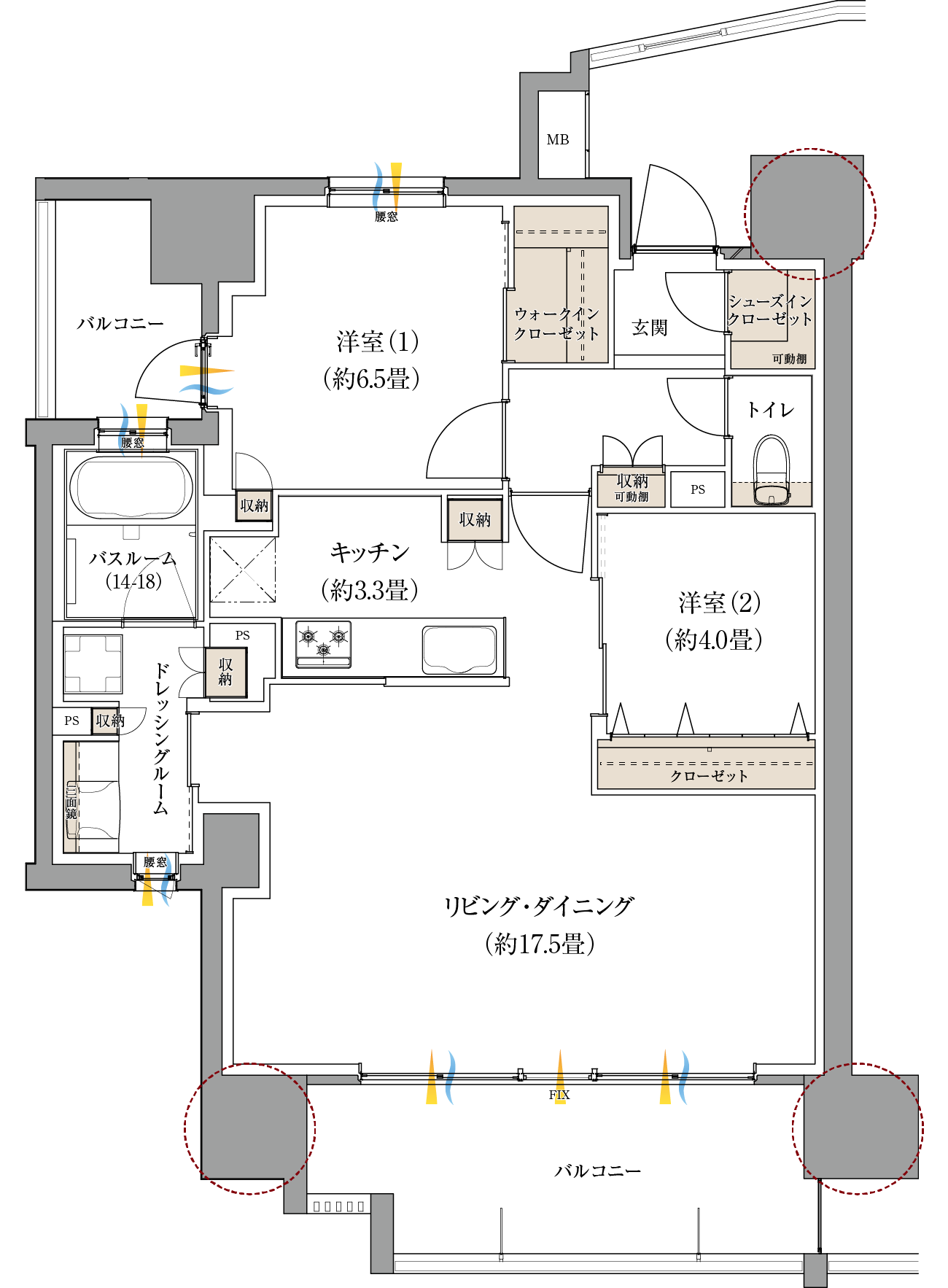 リビング・ダイニングを約17.5畳に拡げた 通風・採光に優れたゆとりの2LDKプラン。