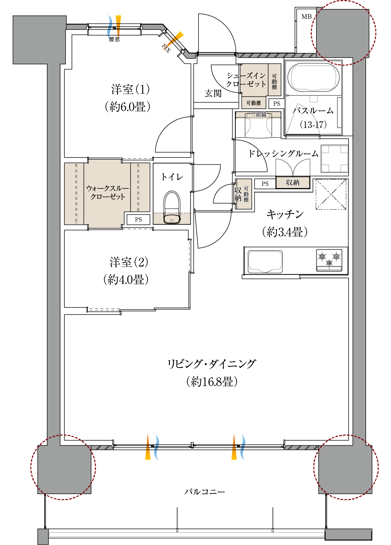 リビング・ダイニングが約16.8畳のゆとりある空間、 大容量のウォークスルークロゼットを設置。
