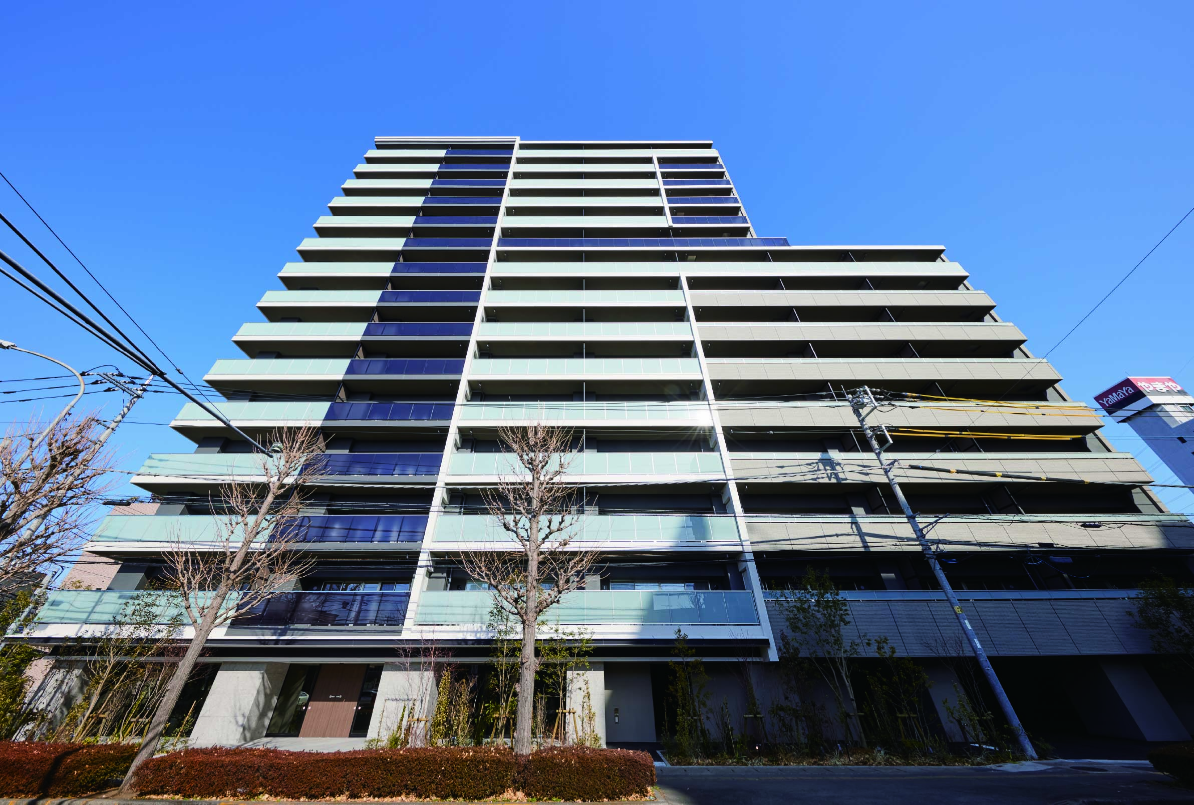 外壁にはグレージュを基調とし、同系色でありながら素材感の異なる磁器質タイルと吹付タイルを組み合わせ上品にコーディネート。陽射しに煌めくブラックと乳白色のガラス手摺りがアクセントとなって、「白楊高通り」と元今泉に新しい風を吹き込みます。