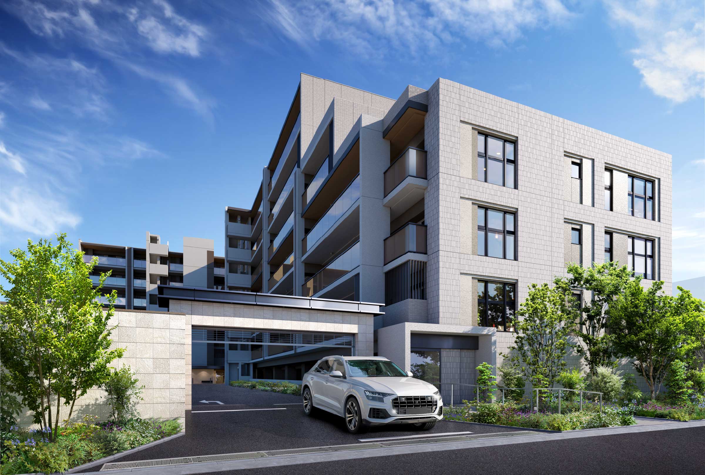 また、敷地境界には大理石調タイルを施した擁壁と植栽を設け、