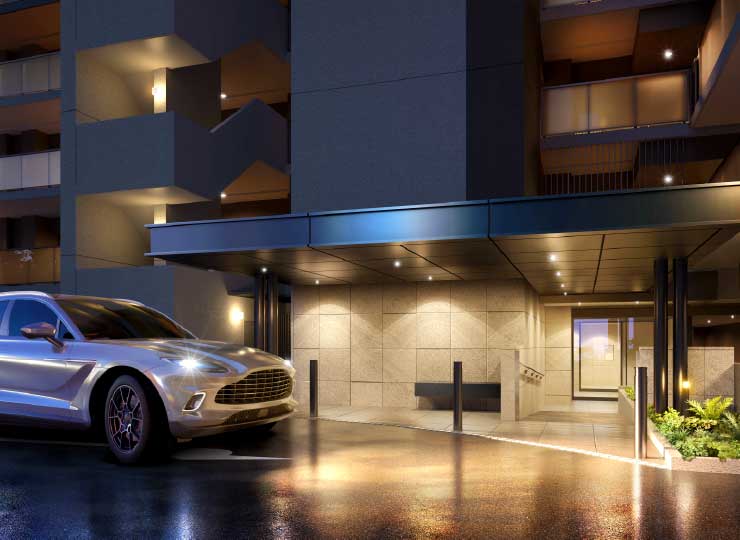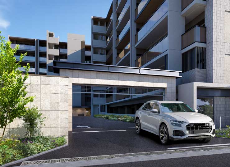 荷物の積み下ろしや送迎ができる車寄せを設置。来客時もスムーズに乗降でき、雨の日でも濡れにくいホテルライクな仕様です。