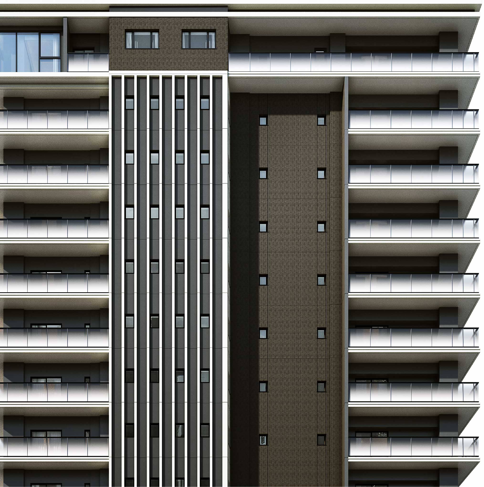 質感豊かな素材が描き出す、都市に調和する美しさ。質感の異なるタイルを組み合わせ、重厚感と洗練を同時に演出。マットな吹付と繊細な縦ラインが、陰影を豊かに刻む。