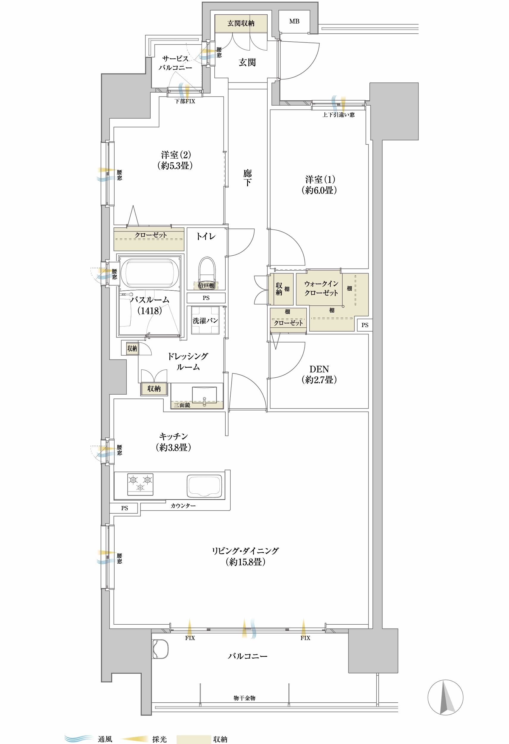 ●角住戸ならではの3面開口。キッチンやバスルームにも窓を設置した通風・採光に優れたプラン。