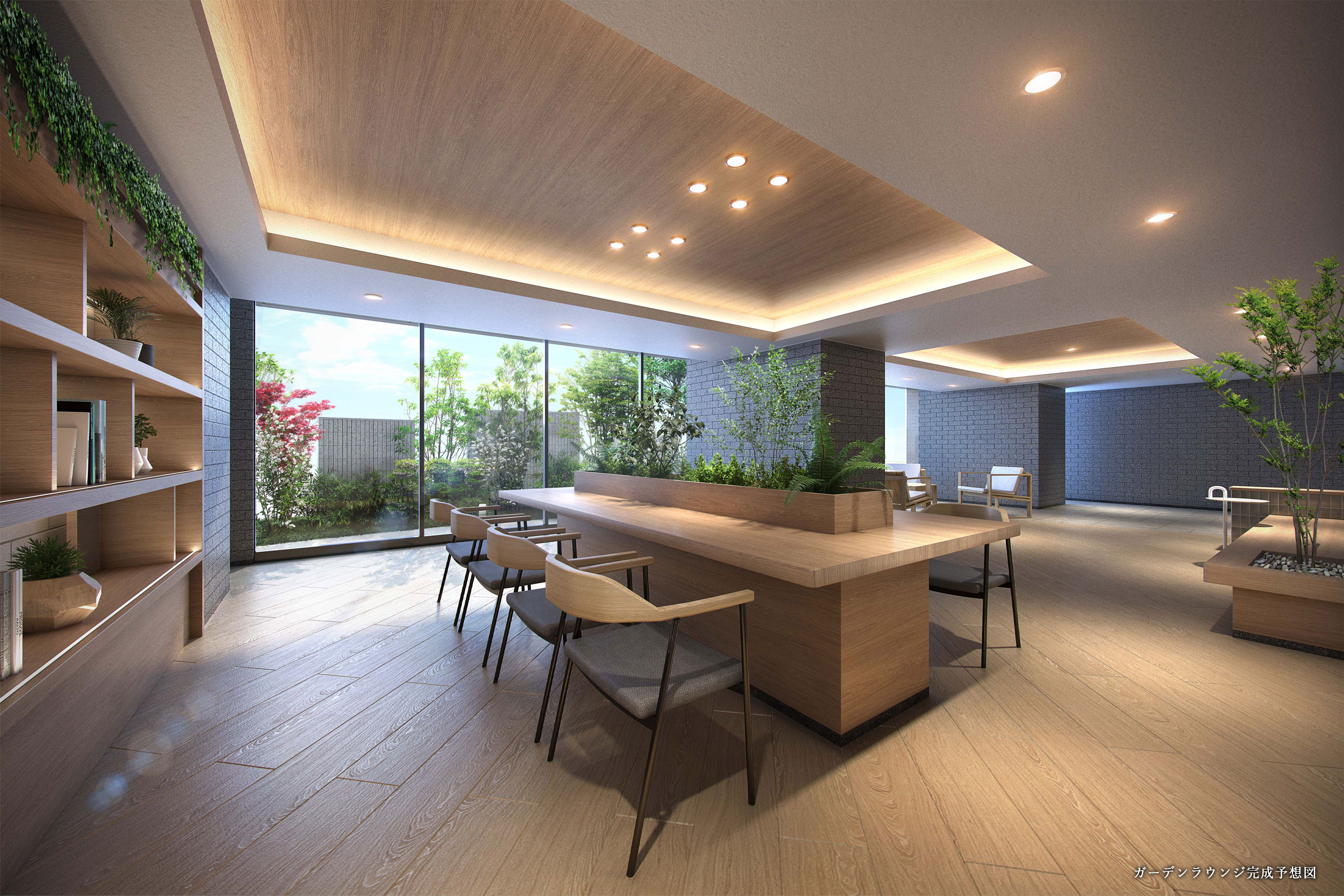 四季を感じられる「ガーデンラウンジ」は、さまざまな使い方のできるコミュニティースペース。