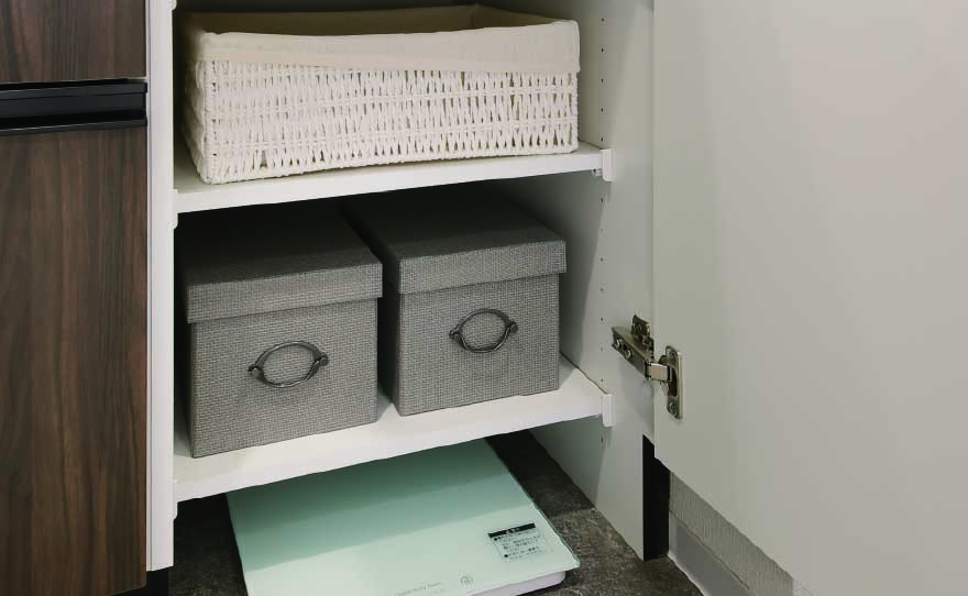 しまいたいモノに合わせて可動棚を調整可能。